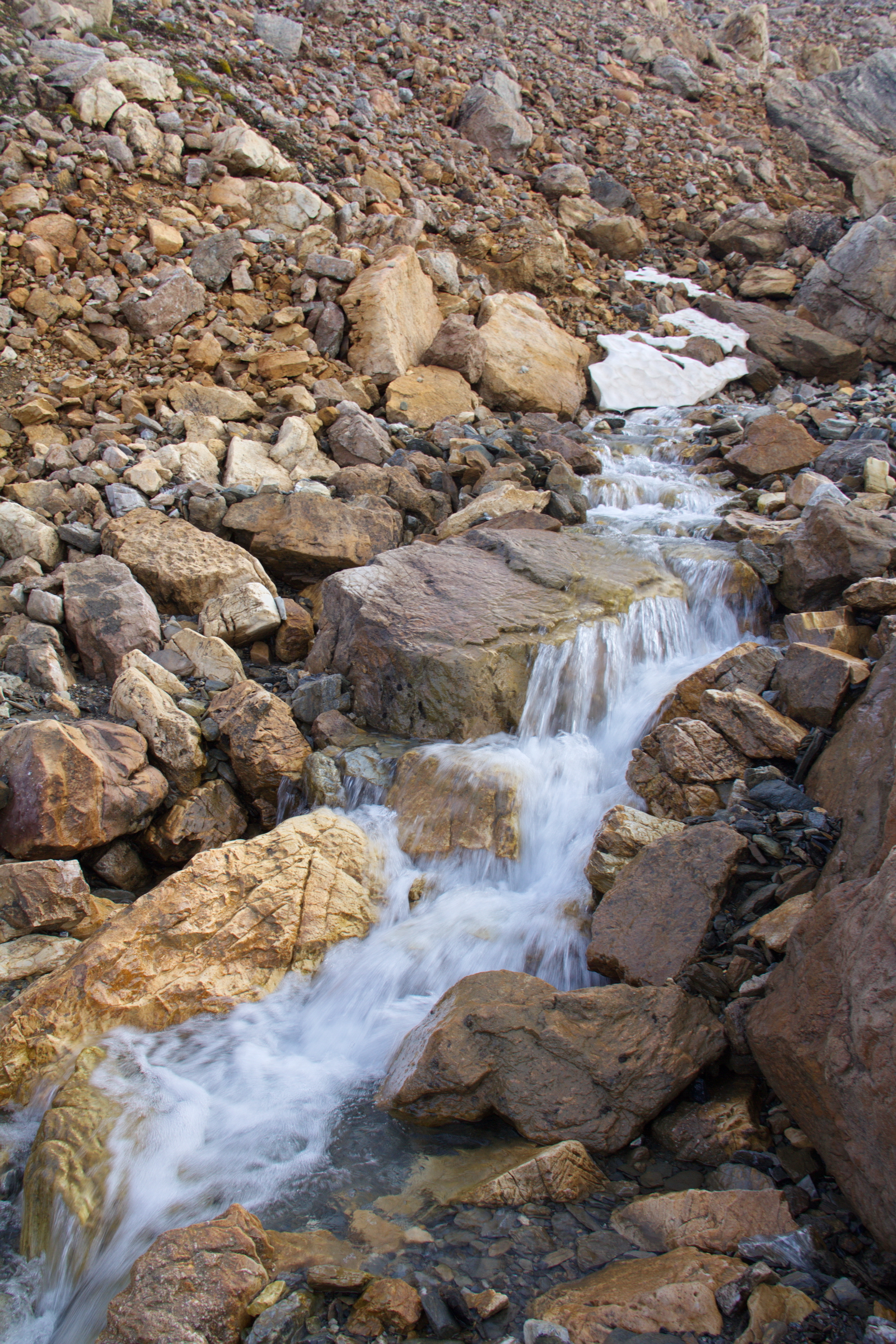 West Spitsbergen Island. Oscar II Land. Svartfjella mountain, slope of NW exposure. Waterfall on the fast stream. On the boulder in a stream under water.