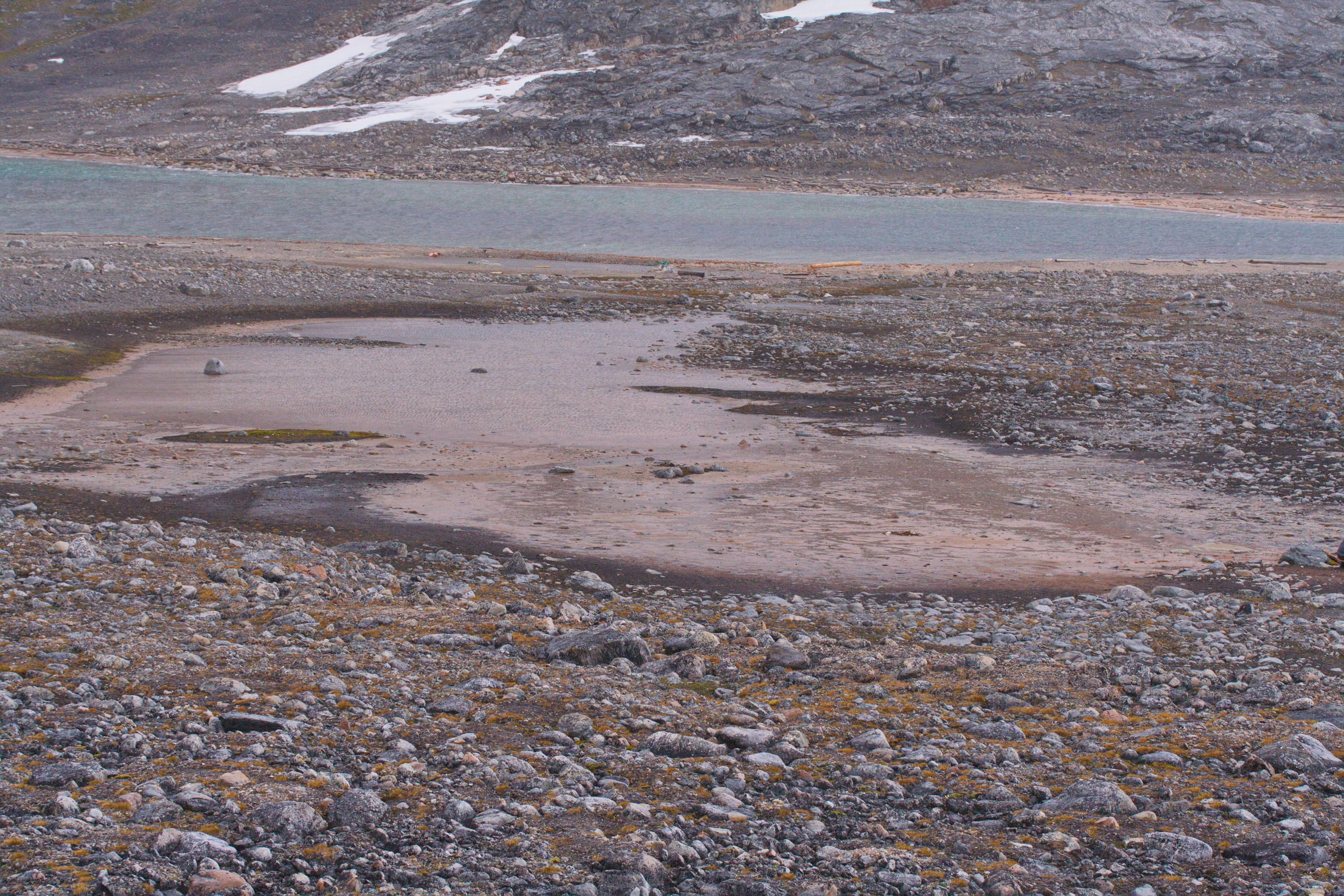 North East Land island (Nordaustlandet). Orvin Land. Duvefjorden bay. Sætherbukta cove. Damflya plain. Stage overgrown shores of lake.