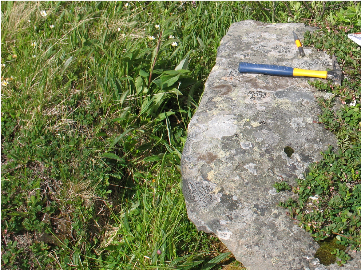 Hammerfest kommune. Island Soroja. Slope of sea shore. Surroundings of the village Akkarfjord. Seaside meadow. Big boulder. Horizontal. hv=5. h=+0,5 m