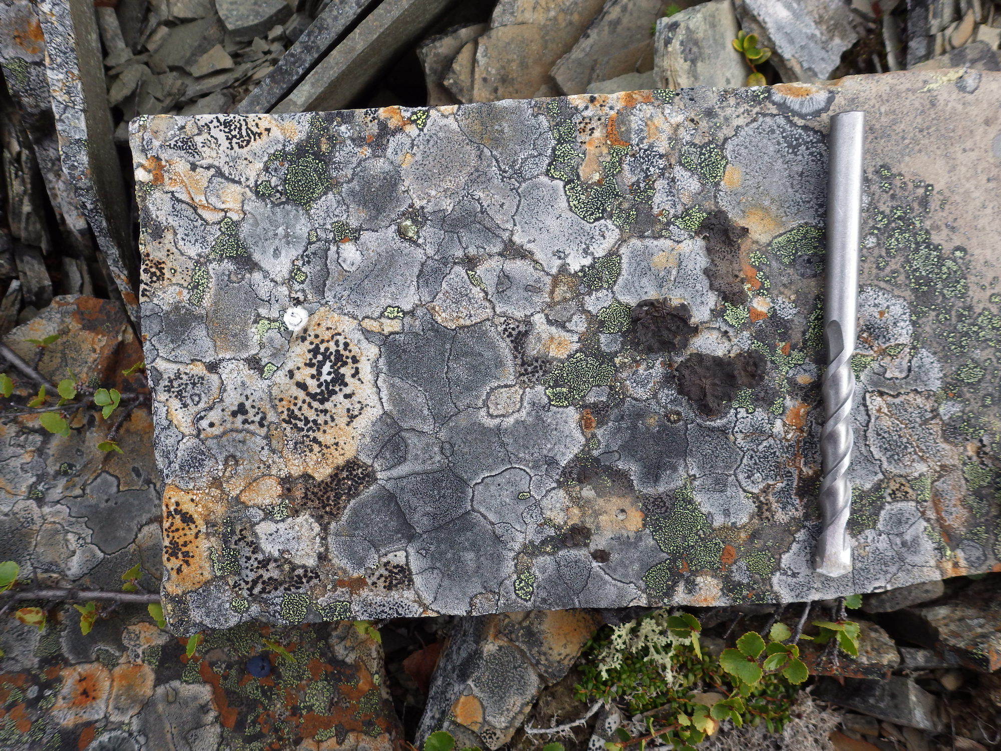 d: Rhizocarpon eupetraeum = 12 mm Rhizocarpon geographicum = 27 mm Bellemerea alpina = 32 mm Tremolecia atrata = 12 mm