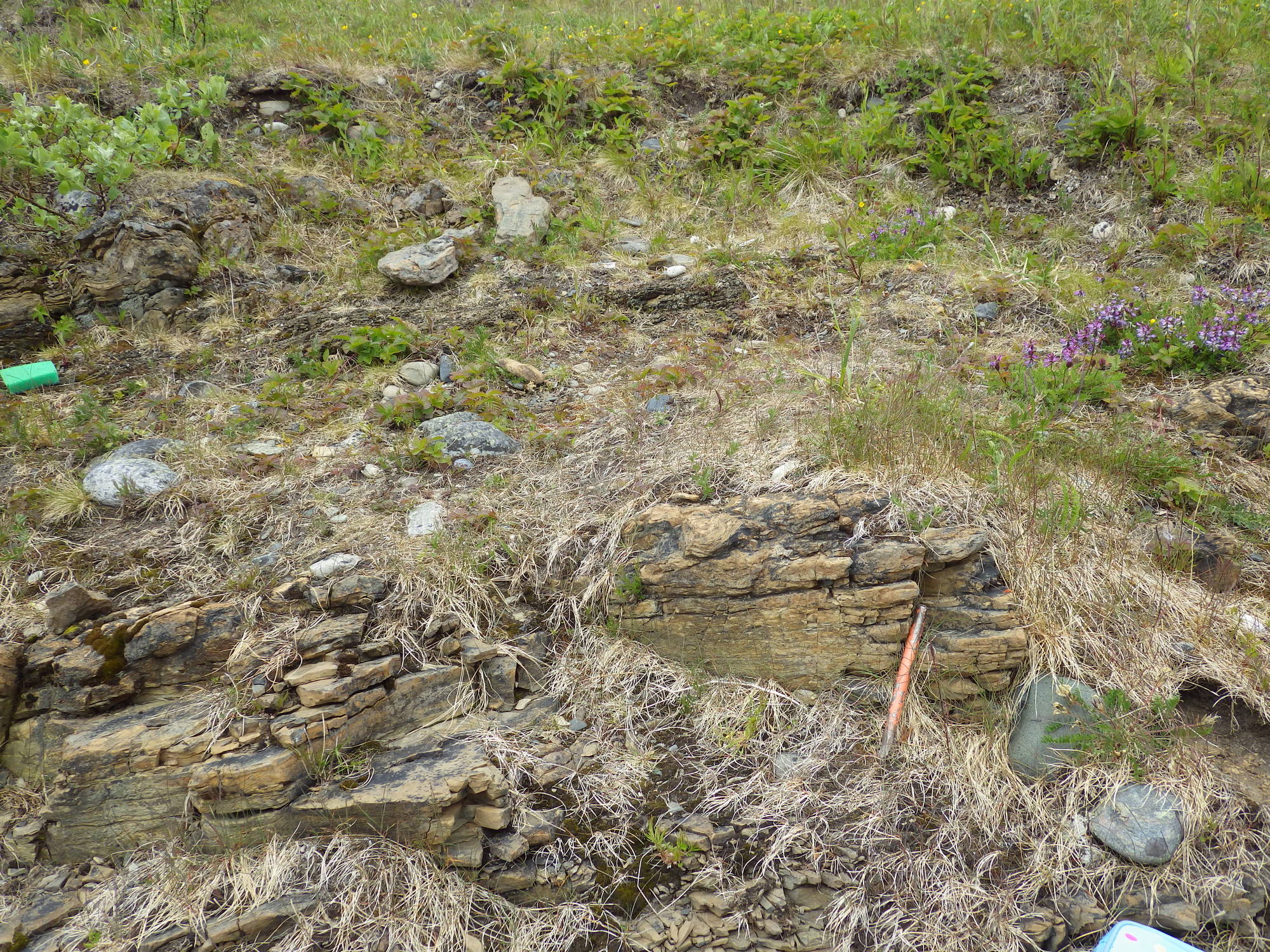 Pechengsky district. Middle peninsula. Coast of Barents sea. Tundra. Shore of Vykat river. Block of cliff. h=0+1,5+2