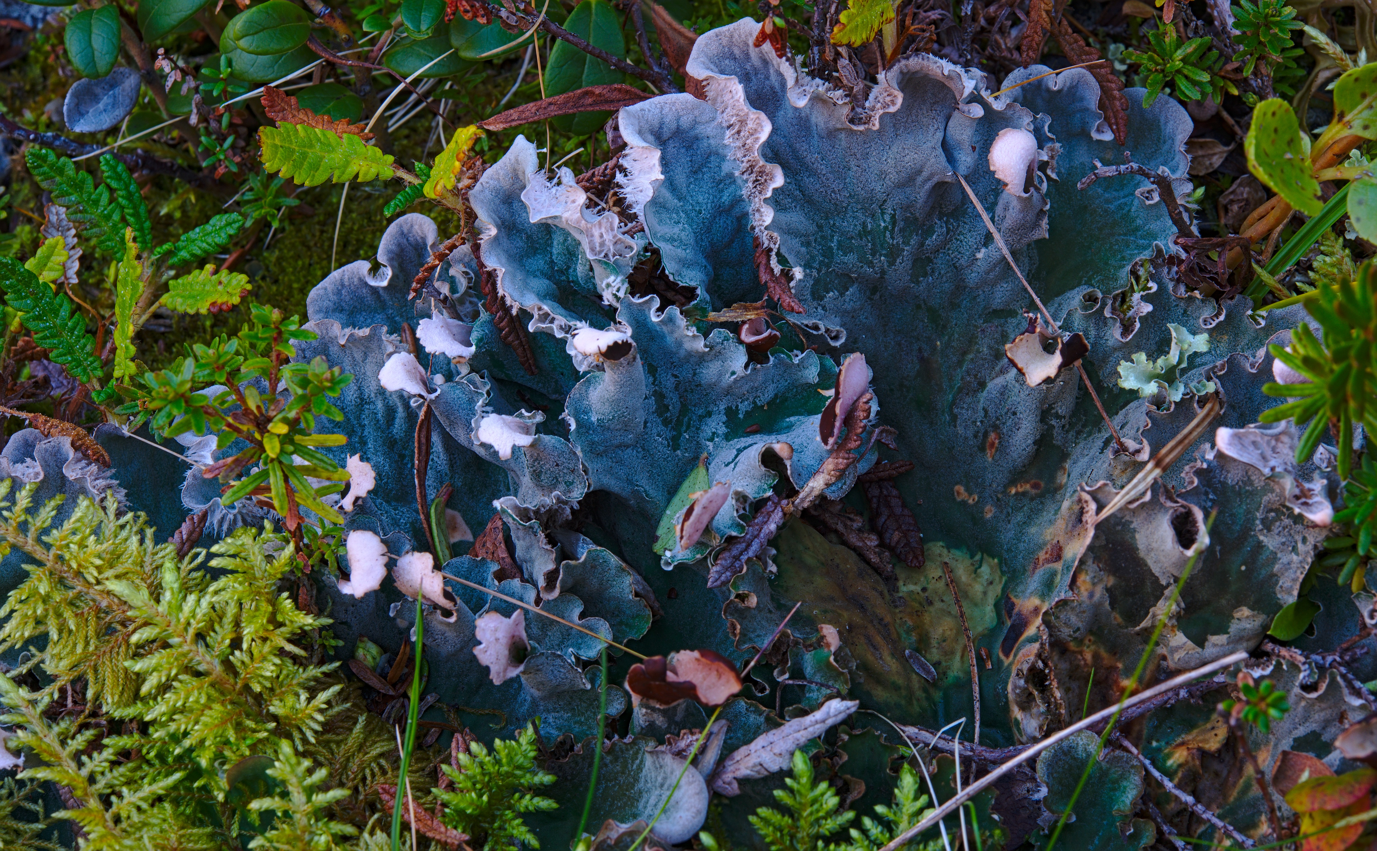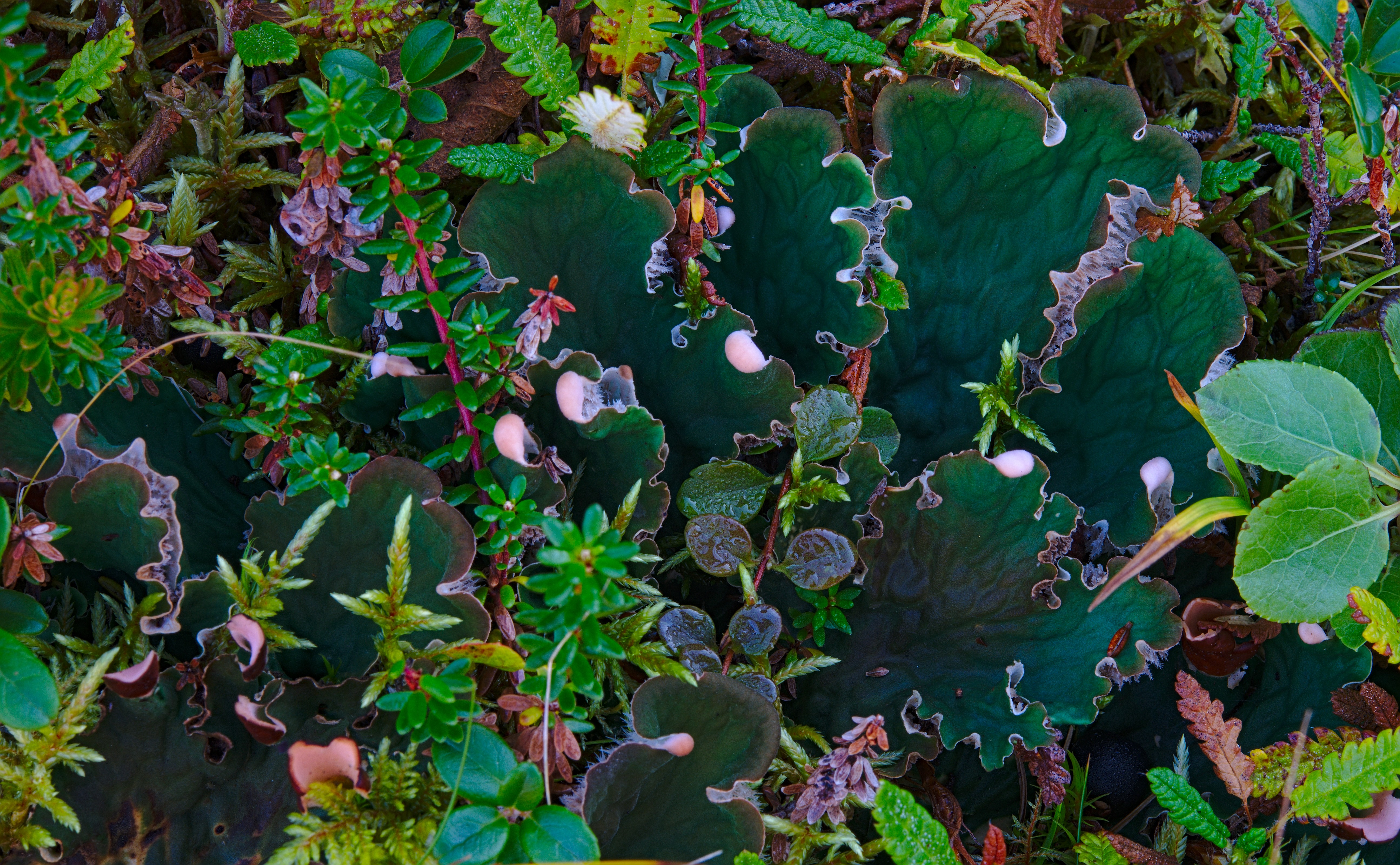 Massif Khibiny. Valley of Blue lakes. Birch forest on Cliffs. Moss curtain on soil (2016m907)